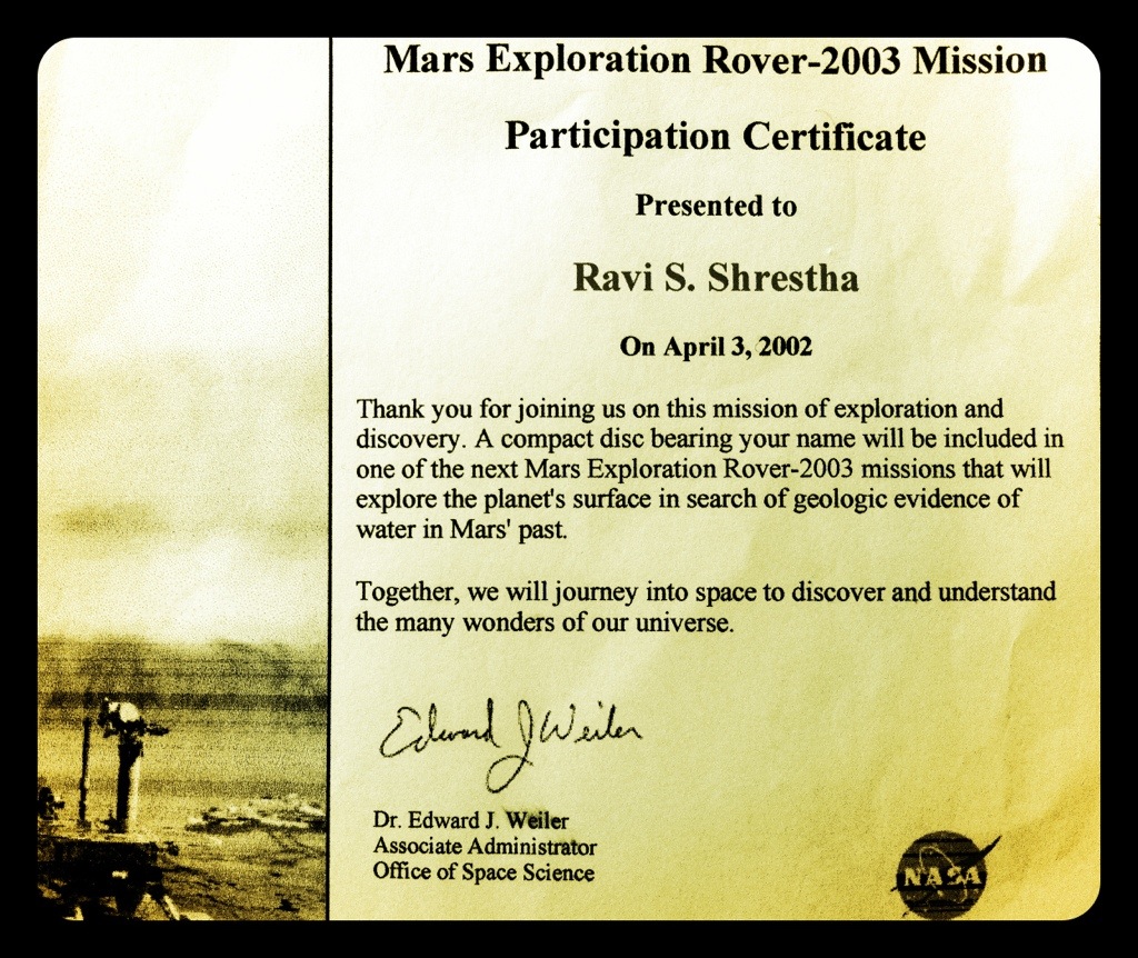 Speaking of red planet exploration, when NASA launched Mars Exploration Rover 2003, they gave everyone an opportunity to submit their names and send it to Mars. NASA etched those names onto a silicon wafer/microchip and installed it in the Rover, which is still roaming the badlands. How cool is that?